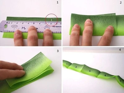 Chia ruy-băng thành 5 đoạn đều nhau, mỗi đoạn 8cm, gập lấy nếp tại điểm đánh dấu, có thể dùng bàn là để là chết nếp vì có những loại ruy-băng khá trơn không dễ dàng tạo nếp khi bạn gập tay.