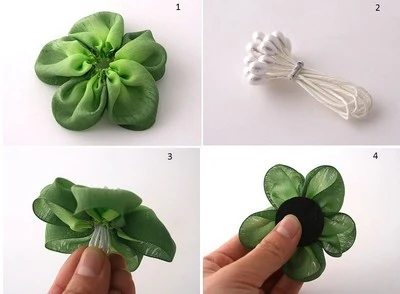 Lật phần cánh hoa căng phồng lên và chỉnh cho các cánh phồng đều nhau. Gập đôi chùm nhị hoa giả và đặt xuyên qua chính giữa hoa, thêm keo viền quanh nhị cho hoa dán chặt ổn định. Cắt bỏ phần cuống nhị thừa và dán vào đó miếng vải dạ tròn nhỏ. Khâu dây buộc tóc vào miếng vải dạ đó là hoàn thành.